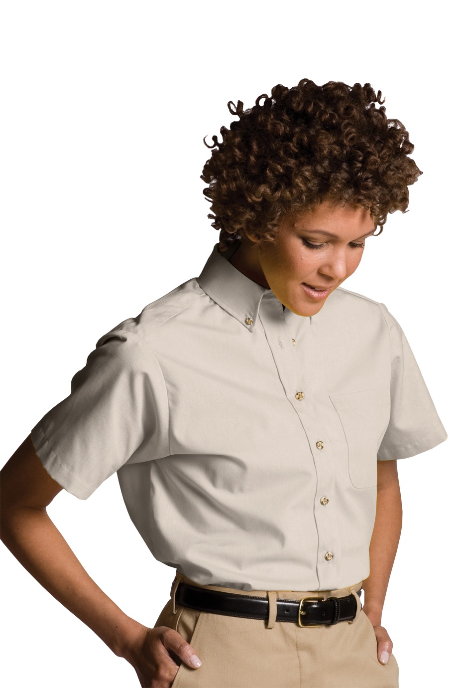 Easy care poplin short sleeve shirt is soft, colorful and hardworking. This performance poplin stands up to demanding wear. Perfect for restaurants, delivery services or any image apparel where perfomance counts. Embroiders well. Men's companion is #1230. 5% poly/35% cotton; 4.0/4.25 oz. wt. Short sleeve with button down collar Wood tone buttons and left chest pocket Fabric wicks moisture Soil release and wrinkle resistant Laundry friendly Women's size: XXS-3XL